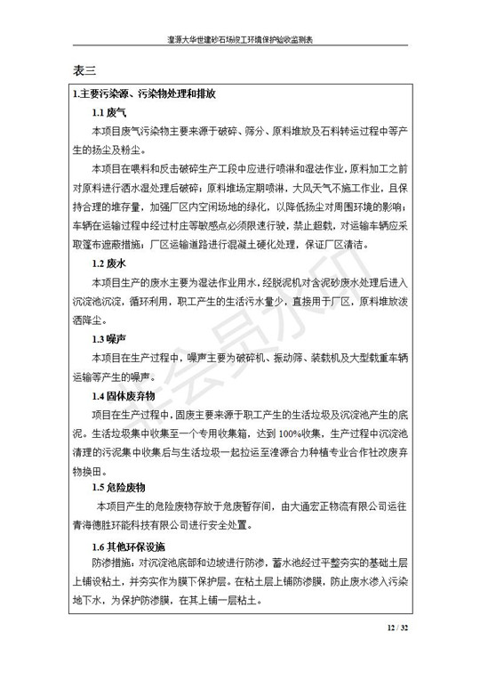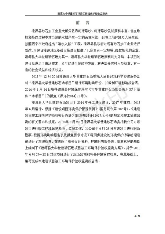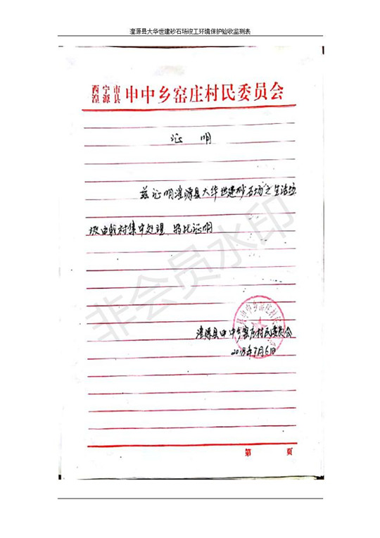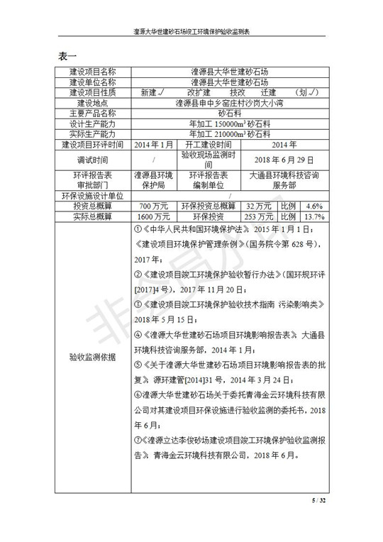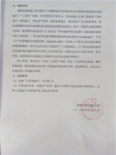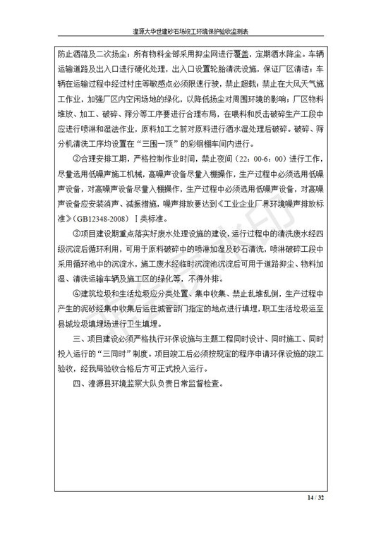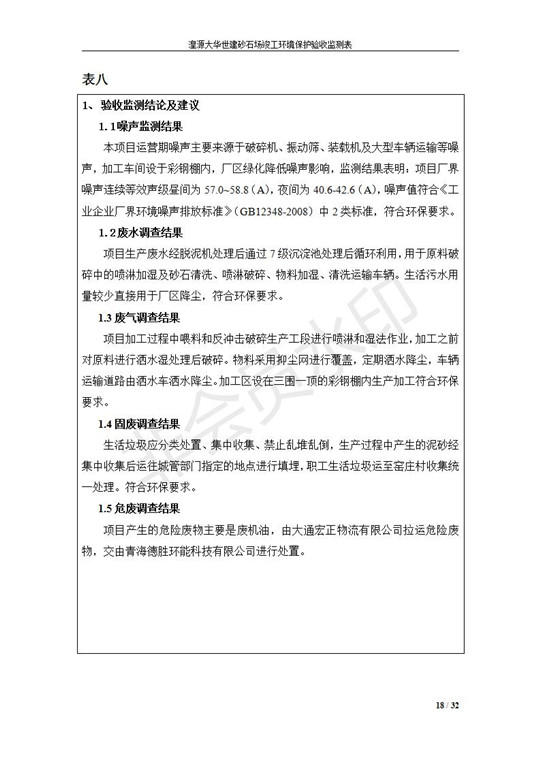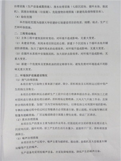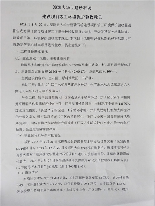 根據(jù)中華人民共和國(guó)國(guó)務(wù)院令第253號(hào)《建設(shè)項(xiàng)目環(huán)境保護(hù)管理?xiàng)l例》(中華人民共和國(guó)國(guó)務(wù)院令第682號(hào)《國(guó)務(wù)院關(guān)于修改〈建設(shè)項(xiàng)目環(huán)境保護(hù)管理?xiàng)l例〉的決定》和《建設(shè)項(xiàng)目竣工環(huán)境保護(hù)驗(yàn)收暫行辦法》,嚴(yán)格依照有關(guān)法律法規(guī),建設(shè)項(xiàng)目環(huán)境保護(hù)設(shè)施驗(yàn)收技術(shù)規(guī)范,本項(xiàng)目環(huán)評(píng)報(bào)告表和環(huán)保審批部門審批意見以及企業(yè)自行驗(yàn)收相關(guān)要求等對(duì)本項(xiàng)目進(jìn)行驗(yàn)收,本項(xiàng)目符合環(huán)保驗(yàn)收條件,可以通過(guò)環(huán)保驗(yàn)收。 湟源大華世建砂石場(chǎng)建設(shè)項(xiàng)目竣工環(huán)境保護(hù)驗(yàn)收意見.