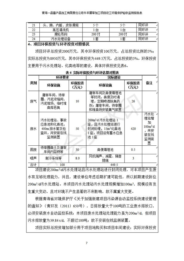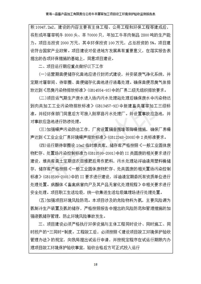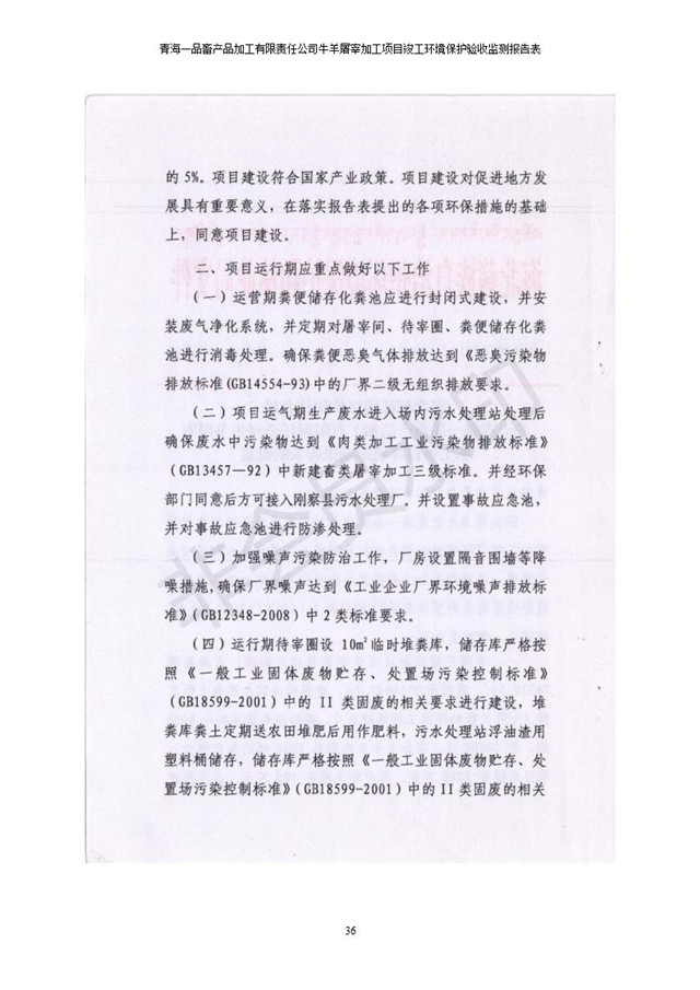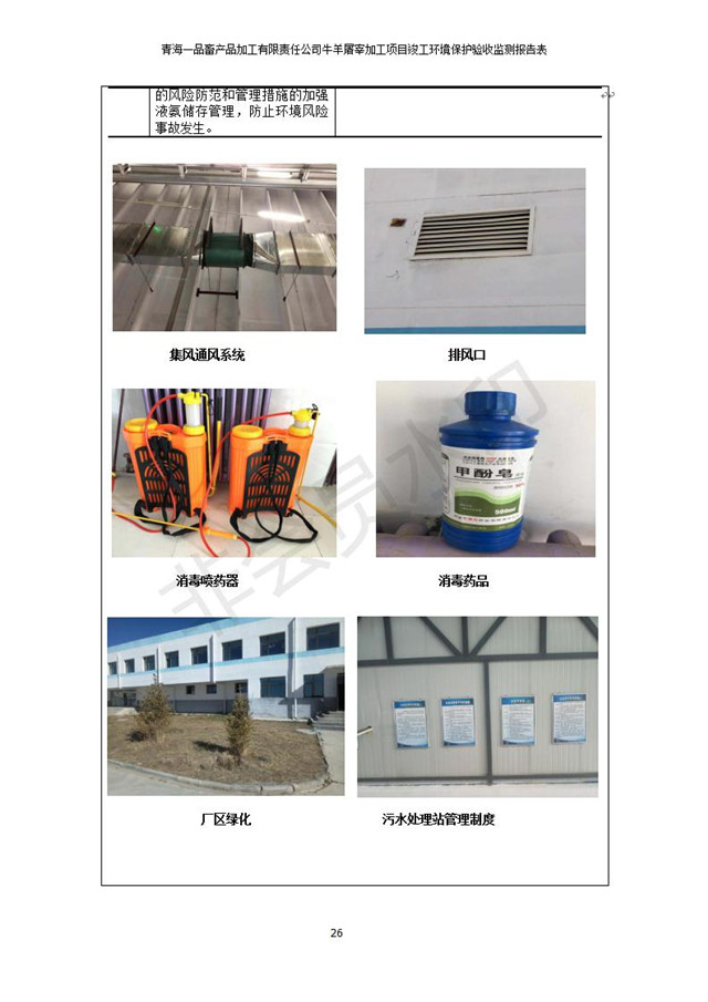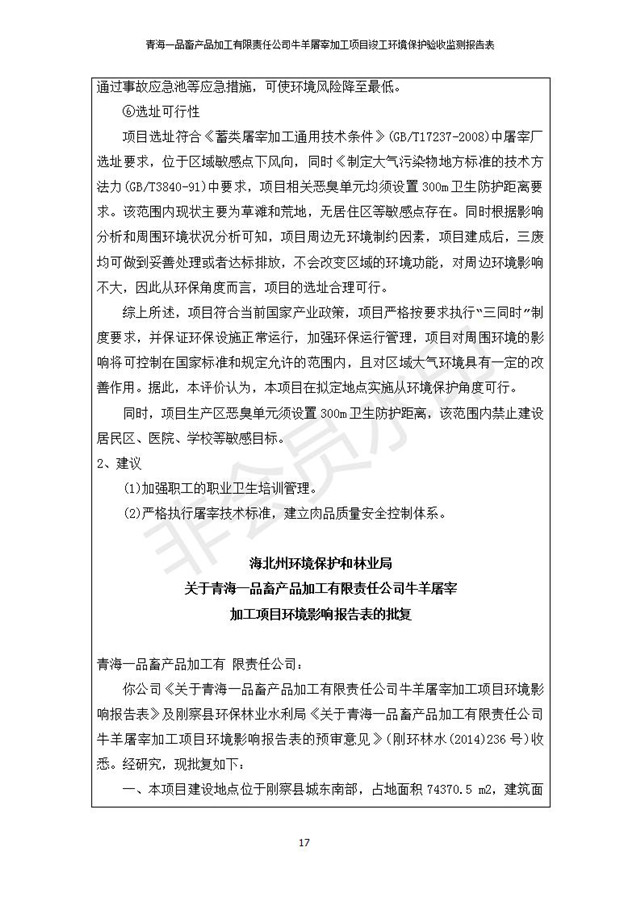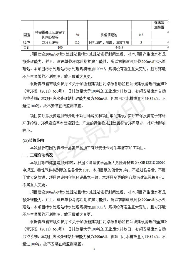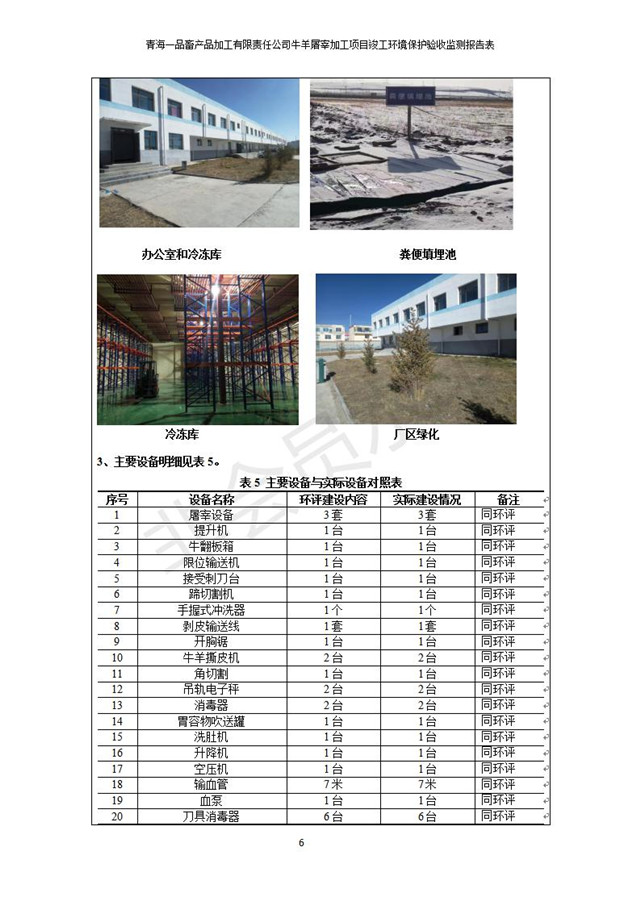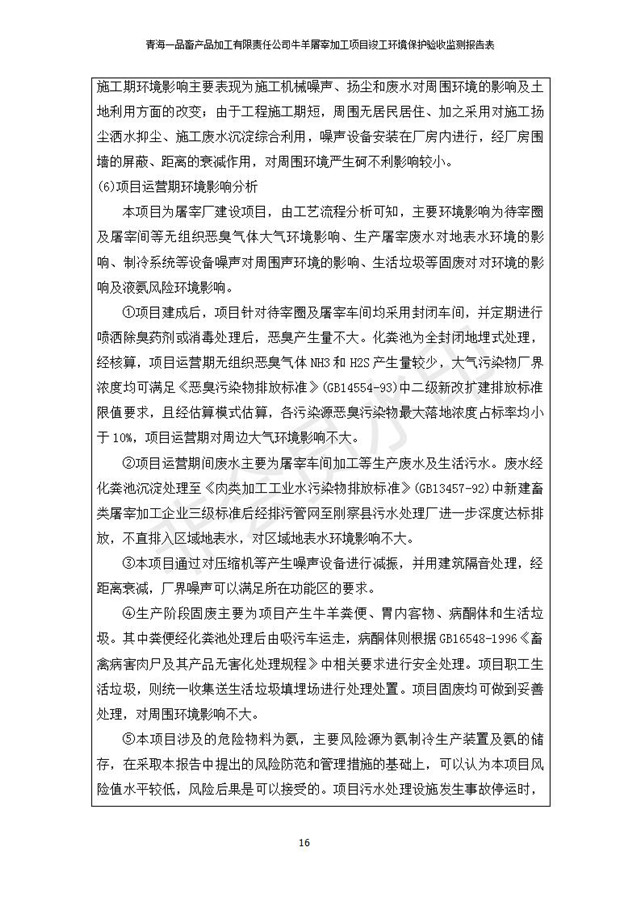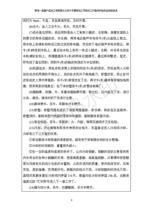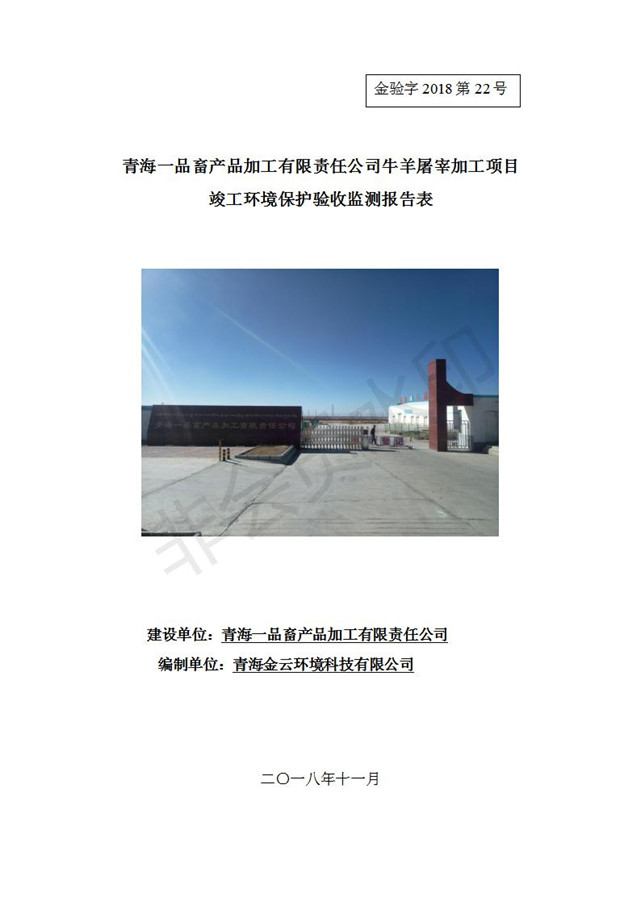 根據(jù)中華人民共和國國務(wù)院令第682號(hào)《國務(wù)院關(guān)于修改〈建設(shè)項(xiàng)目環(huán)境保護(hù)管理?xiàng)l例〉的決定》和《建設(shè)項(xiàng)目竣工環(huán)境保護(hù)驗(yàn)收暫行辦法》(國務(wù)院令682號(hào)),青海一品畜產(chǎn)品加工有限責(zé)任公司牛羊屠宰加工項(xiàng)目(包括竣工環(huán)境保護(hù)驗(yàn)收監(jiān)測報(bào)告表和驗(yàn)收意見)公示如下。 一、項(xiàng)目名稱:青海一品畜產(chǎn)品加工有限責(zé)任公司牛羊屠宰加工項(xiàng)目竣工環(huán)境保護(hù)驗(yàn)收監(jiān)測報(bào)告表 二、地點(diǎn):剛察縣縣城東大街加油站東側(cè) 三、建設(shè)單位:青海一品畜產(chǎn)品加工有限責(zé)任公司 四、建設(shè)內(nèi)容:項(xiàng)目地面積17453m2,項(xiàng)目建設(shè)內(nèi)容包括牛羊屠宰車間、牛羊肉加工車間、冷庫、辦公區(qū)、污水處理站等。 五、聯(lián)系人:張工 七、公示時(shí)間:二〇一九年一月十一日至二〇一九年二月七日 公示期間,對(duì)上述公示內(nèi)容如有異議,請以書面形式反饋,個(gè)人須署真實(shí)姓名,單位須加蓋公章。