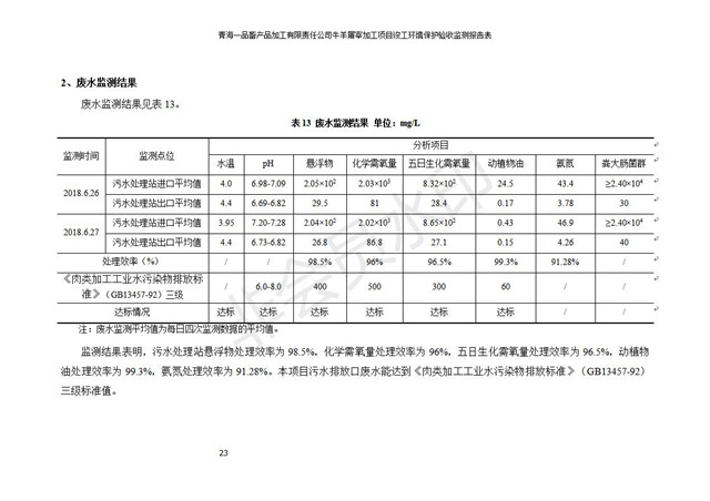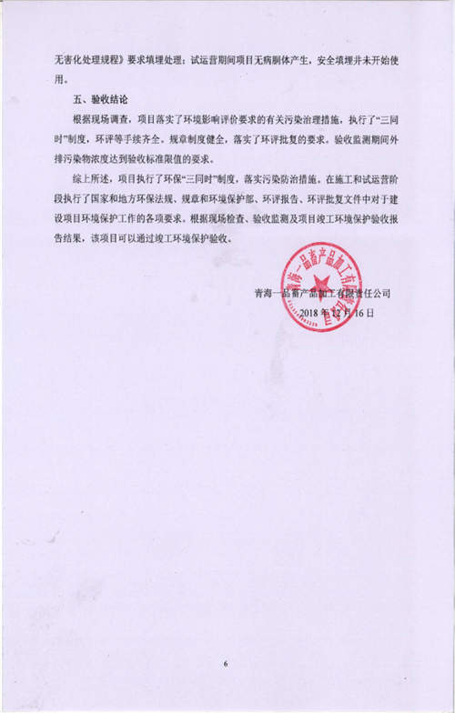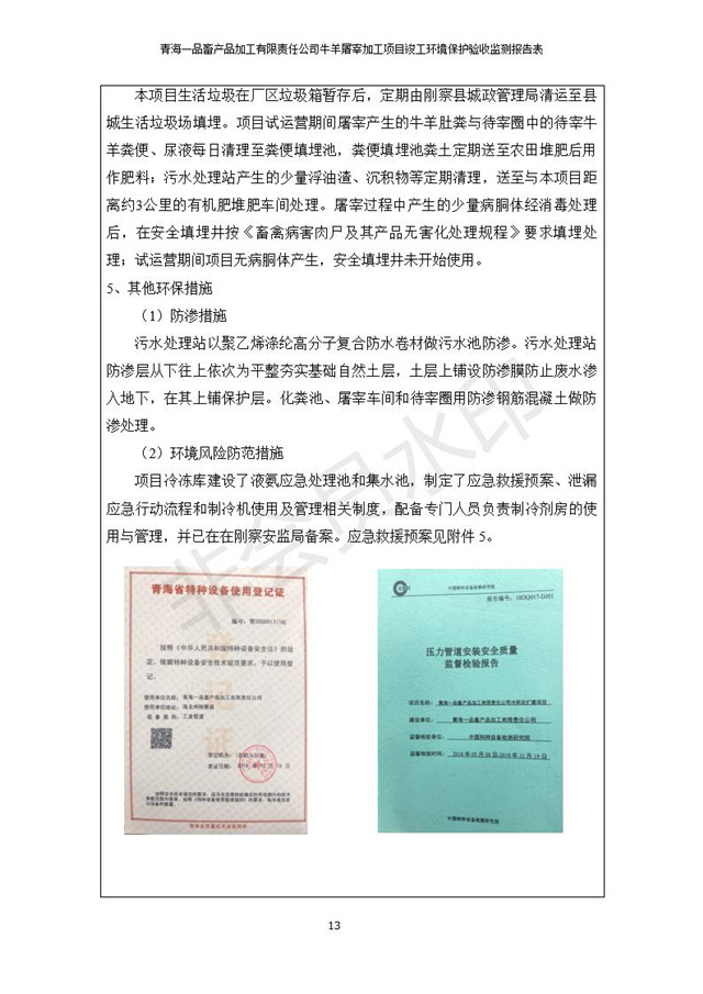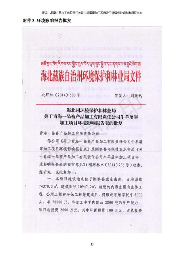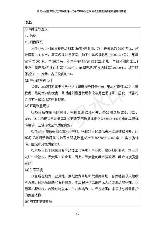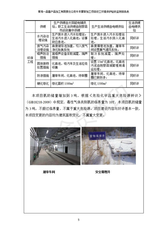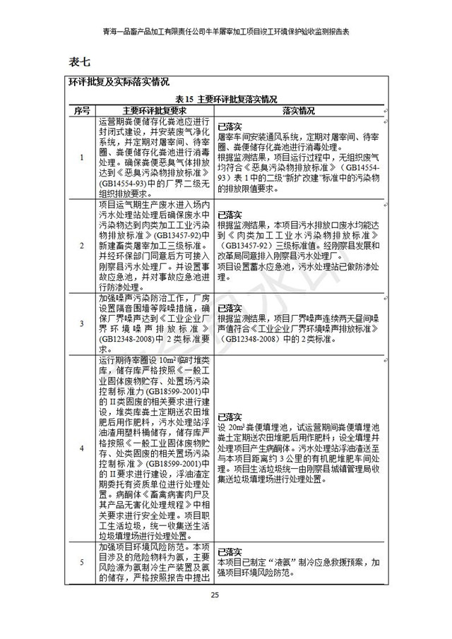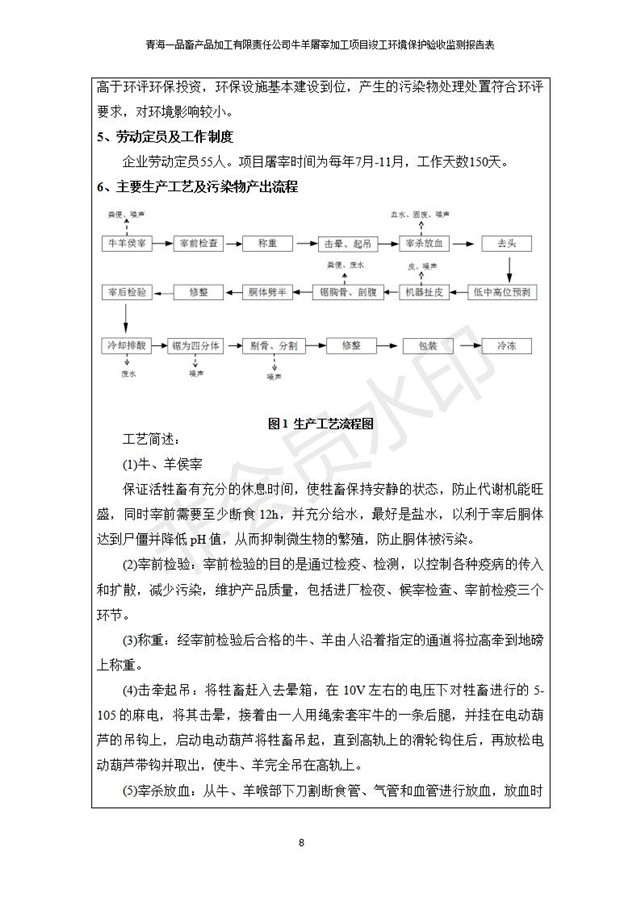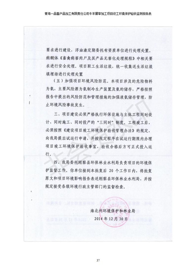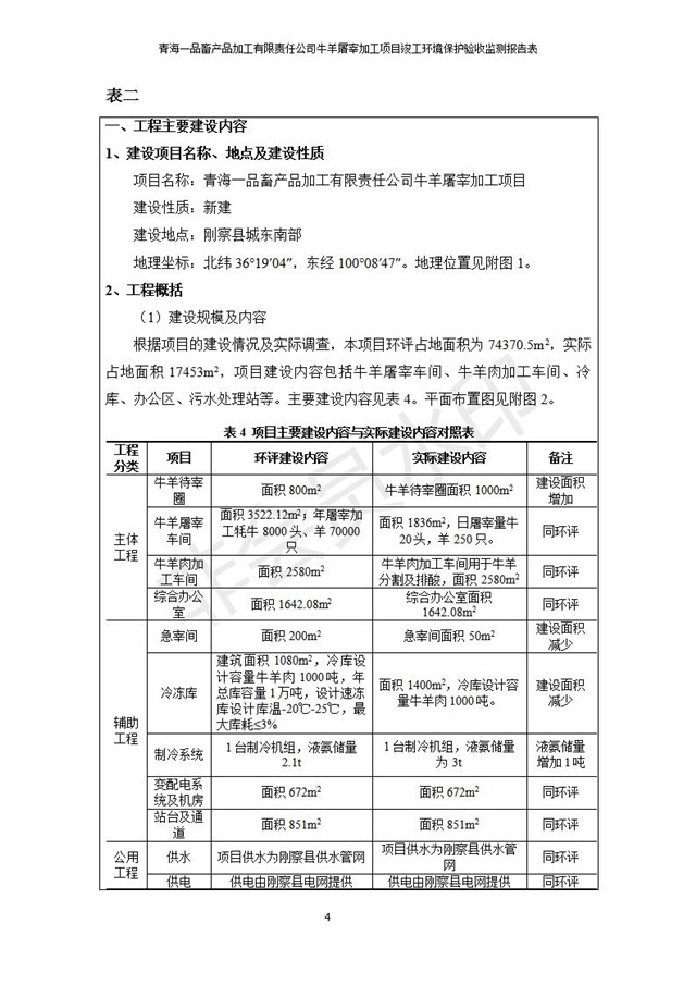 根據(jù)中華人民共和國國務(wù)院令第682號(hào)《國務(wù)院關(guān)于修改〈建設(shè)項(xiàng)目環(huán)境保護(hù)管理?xiàng)l例〉的決定》和《建設(shè)項(xiàng)目竣工環(huán)境保護(hù)驗(yàn)收暫行辦法》(國務(wù)院令682號(hào)),青海一品畜產(chǎn)品加工有限責(zé)任公司牛羊屠宰加工項(xiàng)目(包括竣工環(huán)境保護(hù)驗(yàn)收監(jiān)測報(bào)告表和驗(yàn)收意見)公示如下。 一、項(xiàng)目名稱:青海一品畜產(chǎn)品加工有限責(zé)任公司牛羊屠宰加工項(xiàng)目竣工環(huán)境保護(hù)驗(yàn)收監(jiān)測報(bào)告表 二、地點(diǎn):剛察縣縣城東大街加油站東側(cè) 三、建設(shè)單位:青海一品畜產(chǎn)品加工有限責(zé)任公司 四、建設(shè)內(nèi)容:項(xiàng)目地面積17453m2,項(xiàng)目建設(shè)內(nèi)容包括牛羊屠宰車間、牛羊肉加工車間、冷庫、辦公區(qū)、污水處理站等。 五、聯(lián)系人:張工 七、公示時(shí)間:二〇一九年一月十一日至二〇一九年二月七日 公示期間,對(duì)上述公示內(nèi)容如有異議,請以書面形式反饋,個(gè)人須署真實(shí)姓名,單位須加蓋公章。