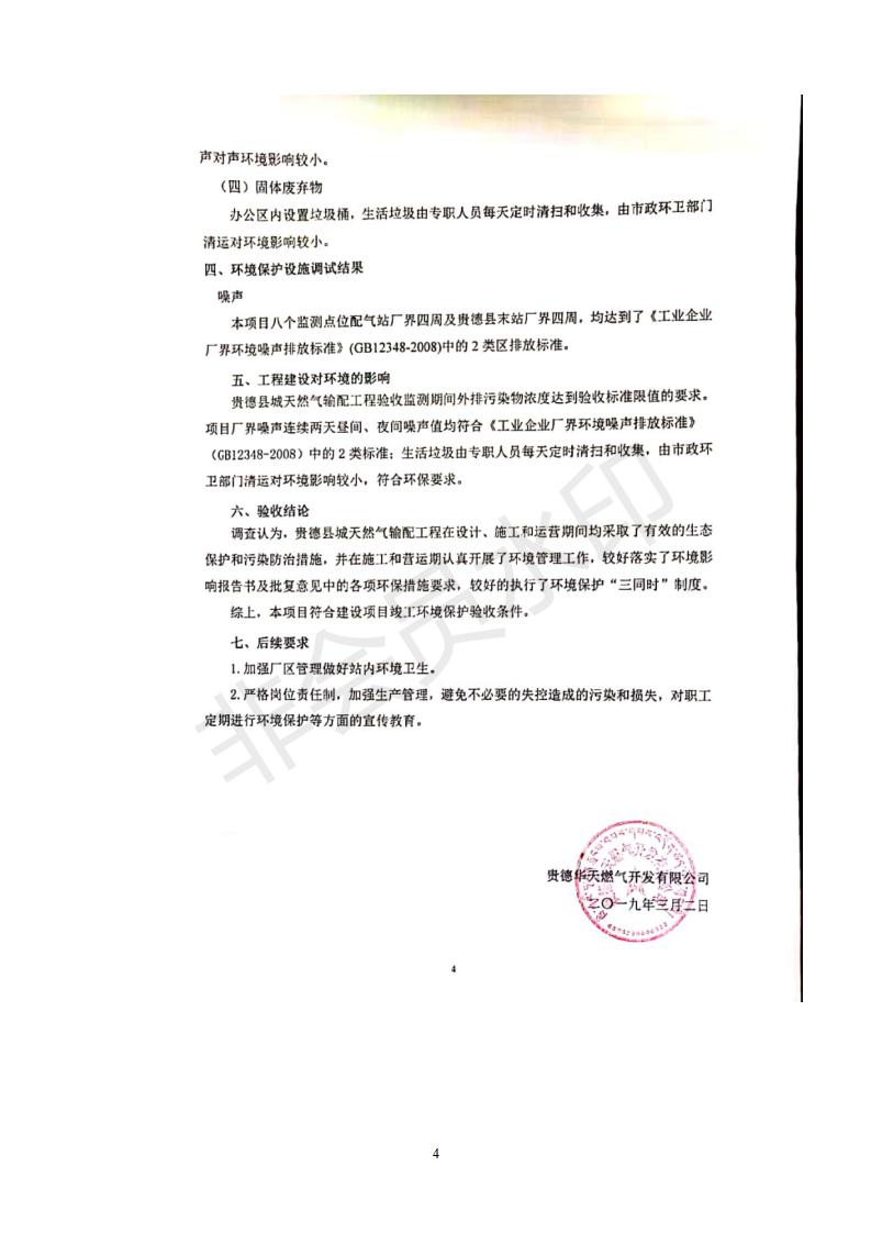 根據(jù)中華人民共和國(guó)務(wù)院令第682號(hào)《國(guó)務(wù)院關(guān)于修改〈建設(shè)項(xiàng)目環(huán)境保護(hù)管理?xiàng)l例〉的決定》和《建設(shè)項(xiàng)目竣工環(huán)境保護(hù)驗(yàn)收暫行辦法》(國(guó)務(wù)院令682號(hào)),貴德縣城輸配管線工程竣工環(huán)境保護(hù)驗(yàn)收內(nèi)容(包括竣工環(huán)境保護(hù)驗(yàn)收調(diào)查表和驗(yàn)收意見)公示如下。 一、項(xiàng)目名稱:貴德縣城天然氣輸配工程 二、地點(diǎn):拉雞蓋澀寧蘭復(fù)線22#閥室-貴德縣城 三、建設(shè)單位:貴德華天燃?xì)忾_發(fā)有限公司 四、建設(shè)內(nèi)容:貴德縣末站、貴德縣配氣站、貴德縣中壓管網(wǎng)、拉雞蓋22#閥室-貴德縣城長(zhǎng)輸管線 五、公示時(shí)間:二〇一九年三月十一日至二〇一九年四月八日 六、聯(lián)系人:張工 公示期間,對(duì)上述公示內(nèi)容如有異議,請(qǐng)以書面形式反饋,個(gè)人須署真實(shí)姓名,單位須加蓋公章。