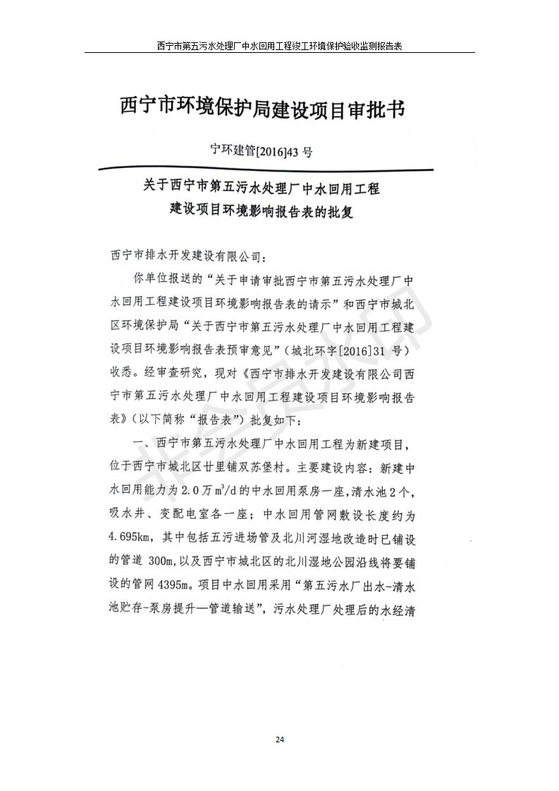 根據(jù)中華人民共和國國務(wù)院令第682號(hào)《國務(wù)院關(guān)于修改〈建設(shè)項(xiàng)目環(huán)境保護(hù)管理?xiàng)l例〉的決定》和《建設(shè)項(xiàng)目竣工環(huán)境保護(hù)驗(yàn)收暫行辦法》(國務(wù)院令682號(hào)),西寧市第五污水處理廠中水回用工程建設(shè)項(xiàng)目(包括竣工環(huán)境保護(hù)驗(yàn)收監(jiān)測報(bào)告表和驗(yàn)收意見)公示如下。 一、項(xiàng)目名稱:西寧市第五污水處理廠中水回用工程建設(shè)項(xiàng)目 二、地點(diǎn):西寧市城北區(qū)廿十里鋪雙蘇堡 三、建設(shè)單位:西寧市排水開發(fā)建設(shè)有限公司