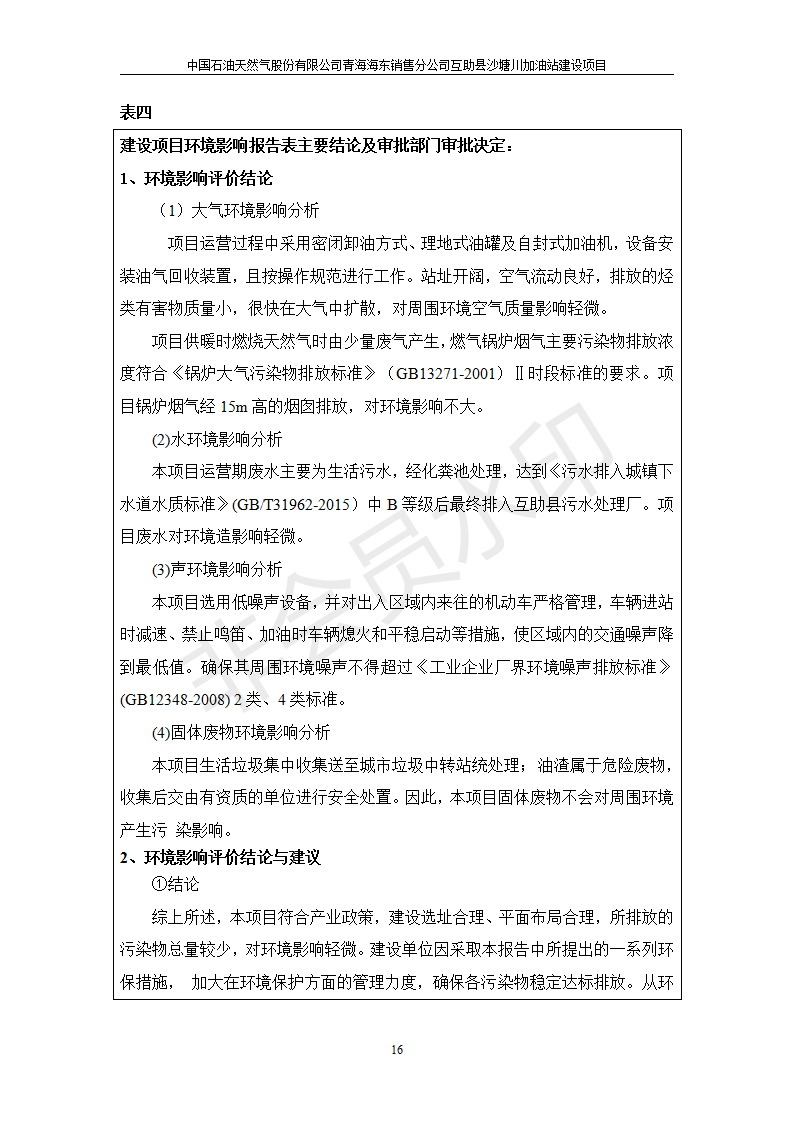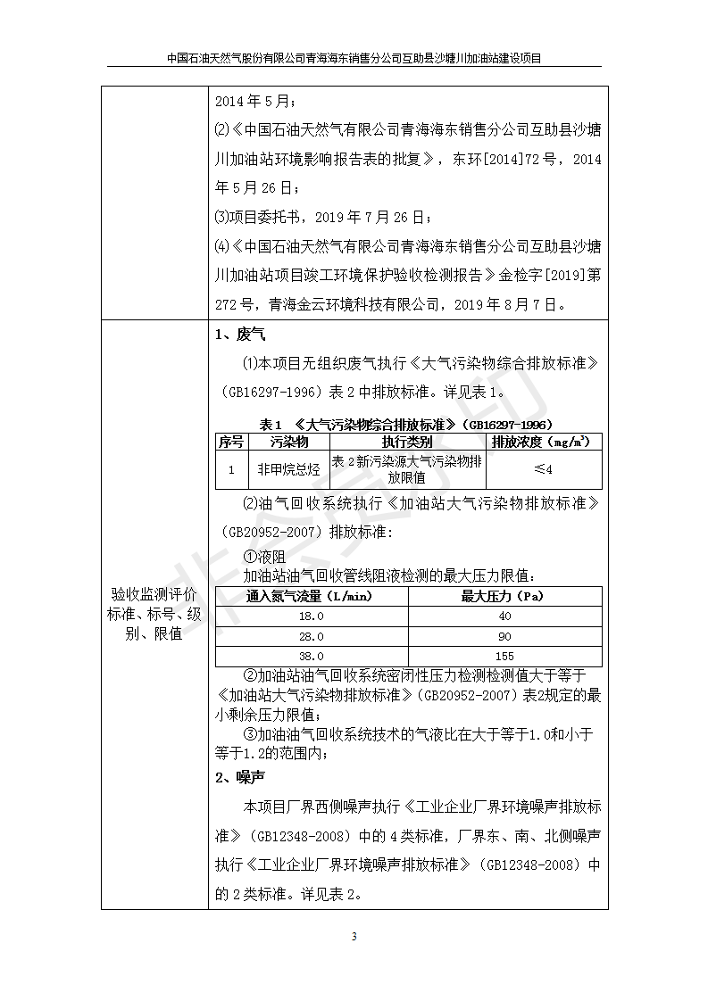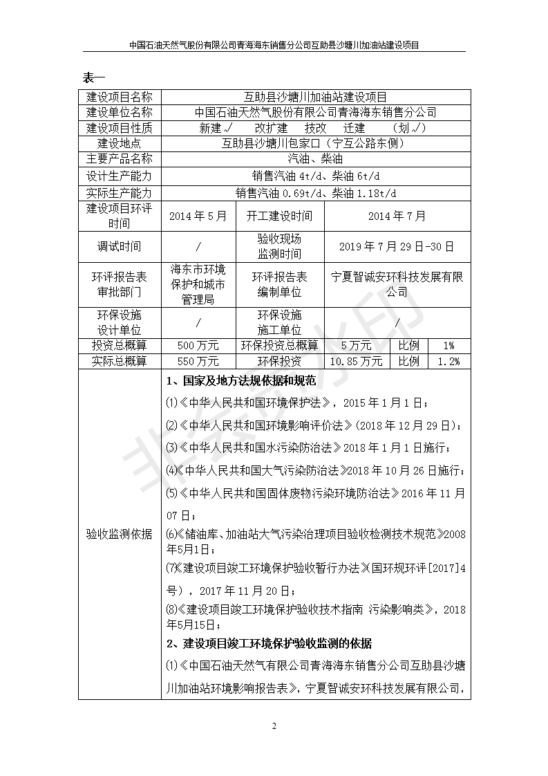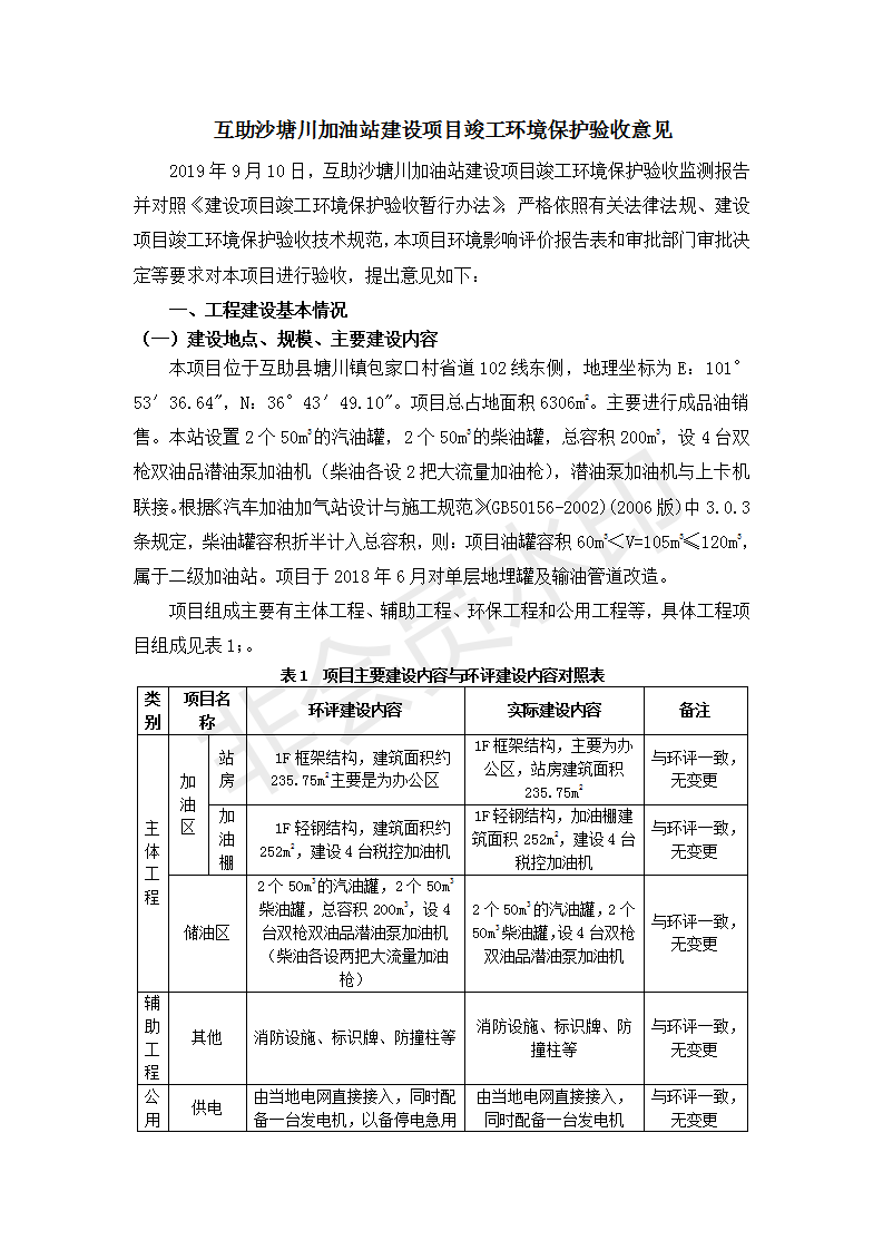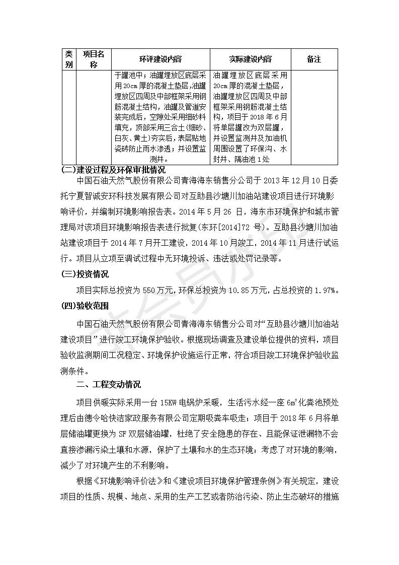 根據(jù)中華人民共和國(guó)國(guó)務(wù)院令第682號(hào)《國(guó)務(wù)院關(guān)于修改〈建設(shè)項(xiàng)目環(huán)境保護(hù)管理?xiàng)l例〉的決定》和《建設(shè)項(xiàng)目竣工環(huán)境保護(hù)驗(yàn)收暫行辦法》(國(guó)務(wù)院令682號(hào)),互助縣沙塘川加油站建設(shè)項(xiàng)目(包括竣工環(huán)境保護(hù)驗(yàn)收監(jiān)測(cè)報(bào)告表和驗(yàn)收意見)公示如下。 一、項(xiàng)目名稱:互助縣沙塘川加油站建設(shè)項(xiàng)目 二、地點(diǎn):互助縣塘川鎮(zhèn)包家口村 六、聯(lián)系電話:0971-6515411 七、公示時(shí)間:二〇一九年九月二十七日至二〇一九年十月二十九日 公示期間,對(duì)上述公示內(nèi)容如有異議,請(qǐng)以書面形式反饋,個(gè)人須署真實(shí)姓名,單位須加蓋公章。