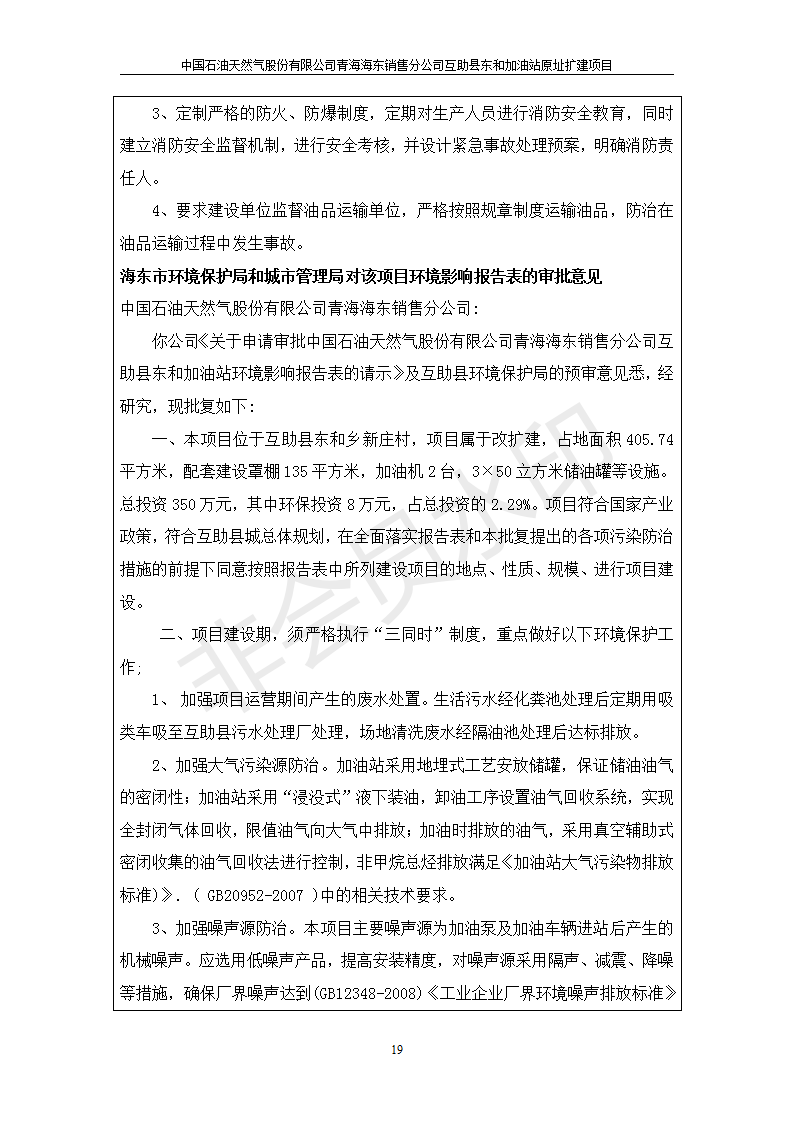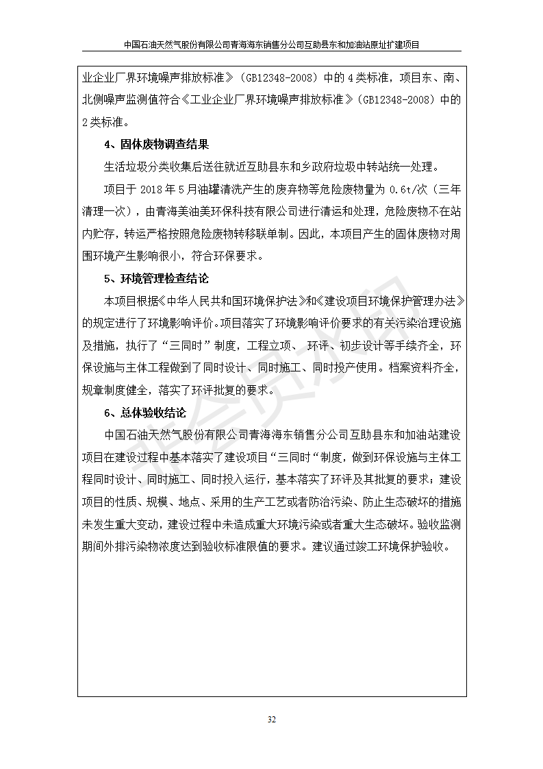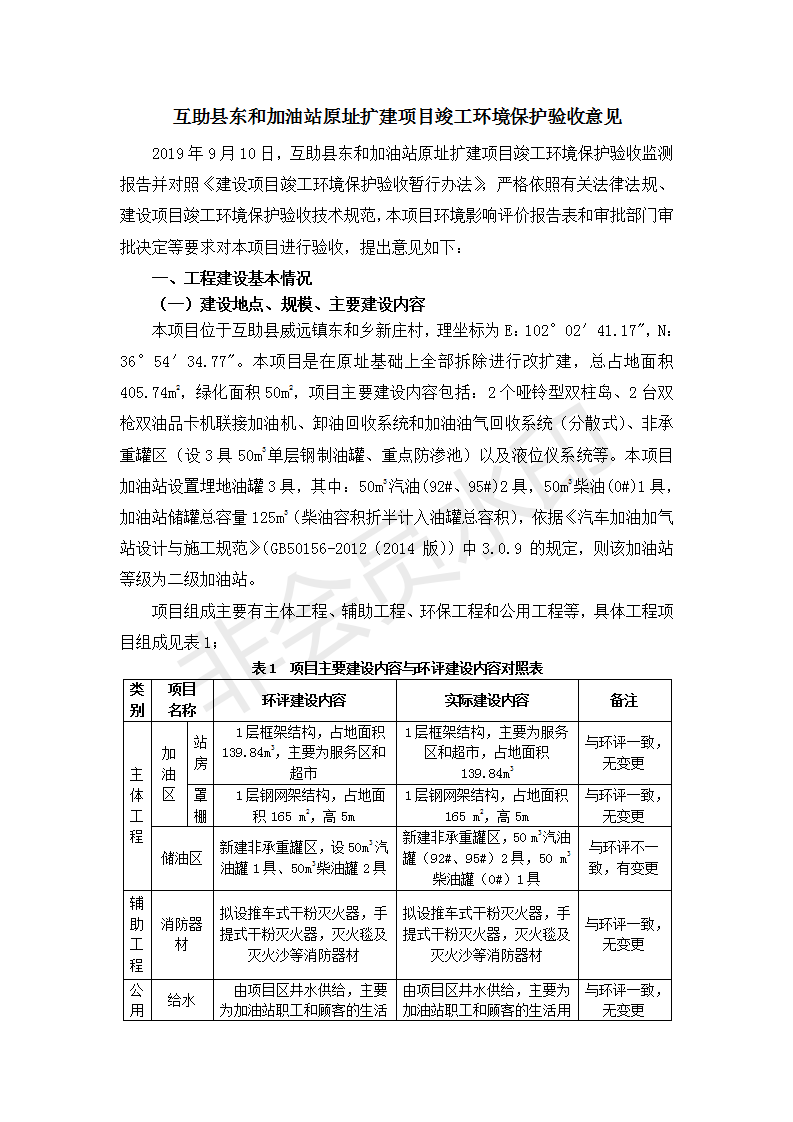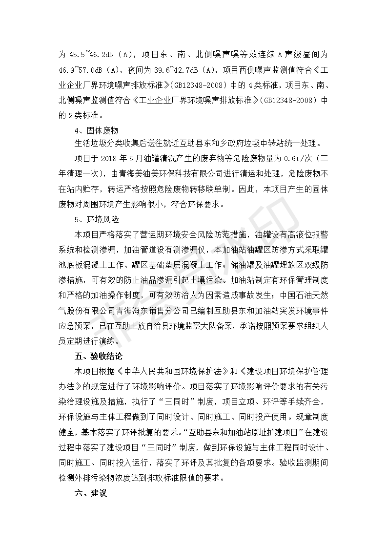 根據(jù)中華人民共和國國務(wù)院令第682號《國務(wù)院關(guān)于修改〈建設(shè)項目環(huán)境保護(hù)管理條例〉的決定》和《建設(shè)項目竣工環(huán)境保護(hù)驗收暫行辦法》(國務(wù)院令682號),互助縣東和加油站原址擴(kuò)建項目(包括竣工環(huán)境保護(hù)驗收監(jiān)測報告表和驗收意見)公示如下。 一、項目名稱:互助縣東和加油站原址擴(kuò)建項目 二、地點(diǎn):互助縣威遠(yuǎn)鎮(zhèn)東和鄉(xiāng)新莊村 六、聯(lián)系電話:0971-6515411 七、公示時間:二〇一九年九月二十七日至二〇一九年十月二十九日 公示期間,對上述公示內(nèi)容如有異議,請以書面形式反饋,個人須署真實姓名,單位須加蓋公章。