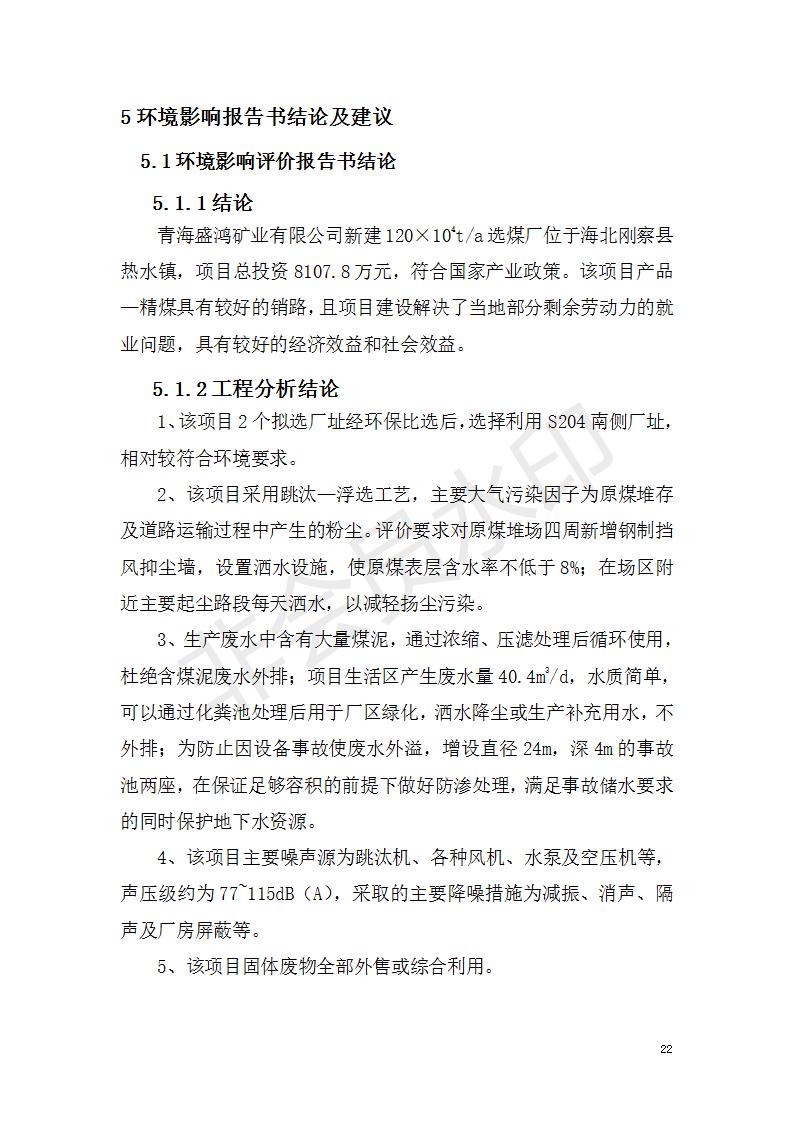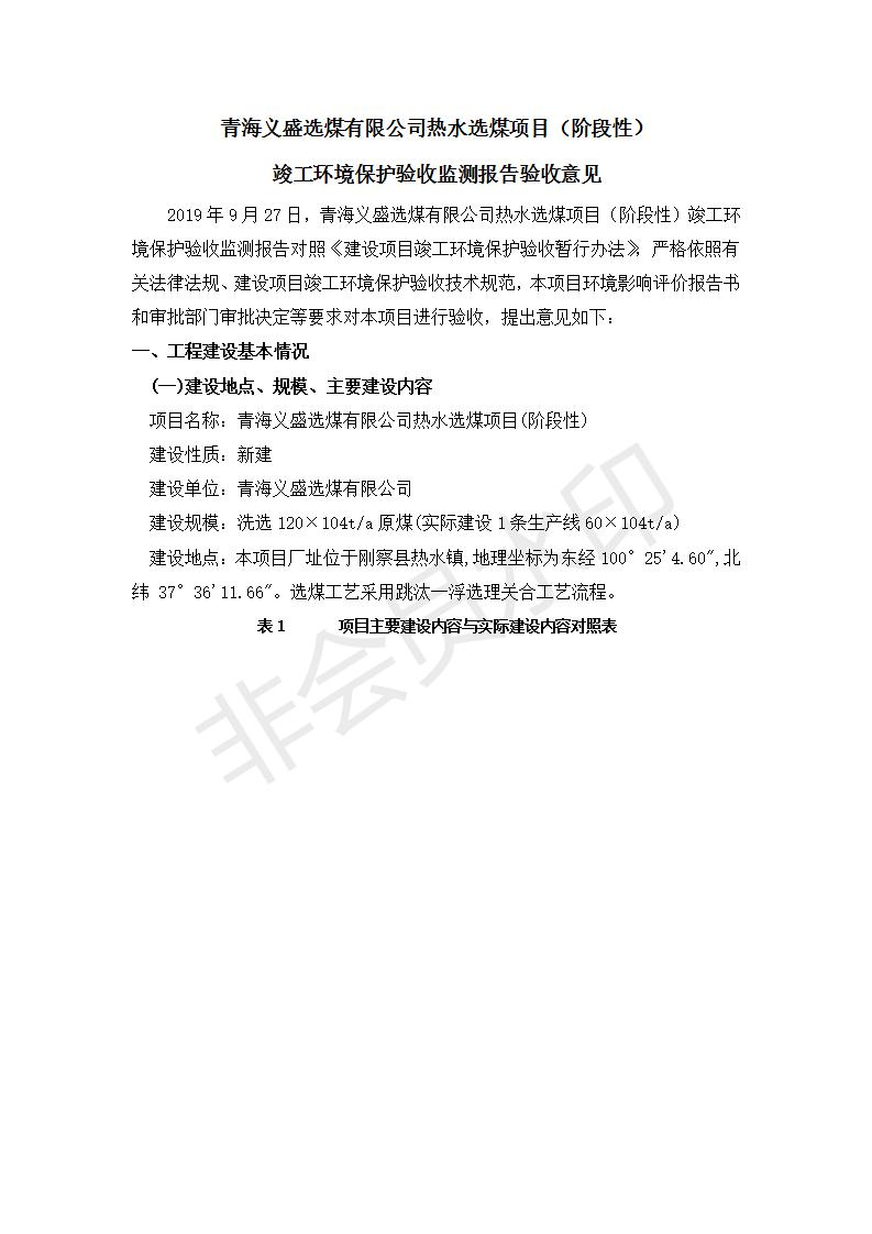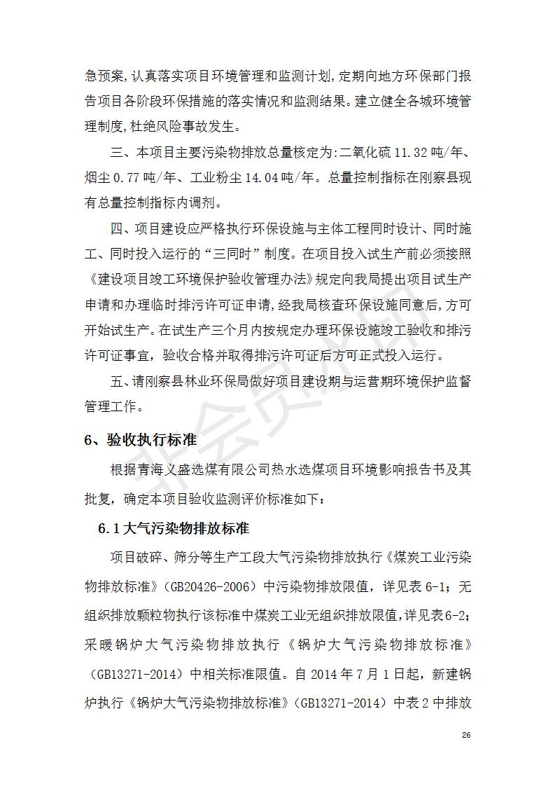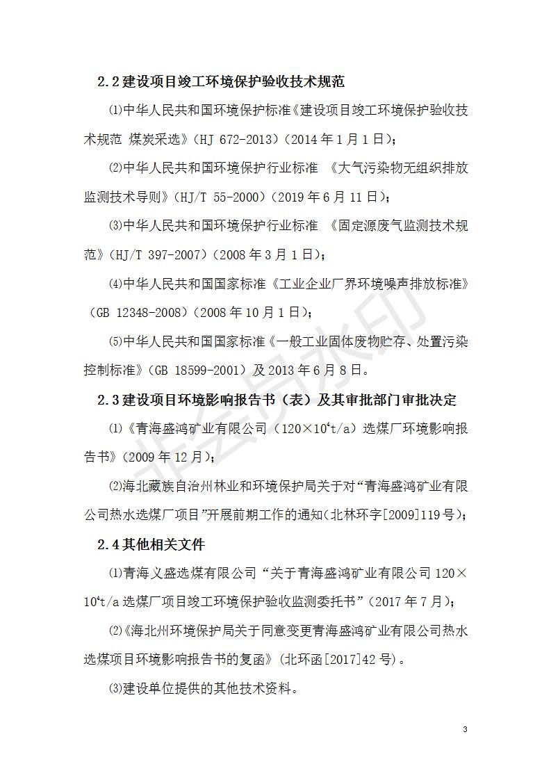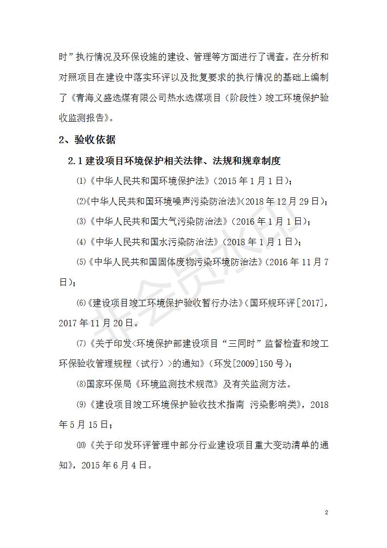 根據(jù)中華人民共和國國務(wù)院令第682號《國務(wù)院關(guān)于修改〈建設(shè)項目環(huán)境保護管理條例〉的決定》和《建設(shè)項目竣工環(huán)境保護驗收暫行辦法》(國務(wù)院令682號),青海義盛選煤有限公司熱水選煤項目(階段性)竣工環(huán)境保護驗收監(jiān)測報告(包括竣工環(huán)境保護驗收監(jiān)測報告和驗收意見)公示如下。 一、項目名稱:青海義盛選煤有限公司熱水選煤項目(階段性) 二、地點:剛察縣熱水鎮(zhèn) 此外還包括公用工程系統(tǒng)、消防系統(tǒng)及輔助生產(chǎn)設(shè)施等。 五、聯(lián)系人:張工六、聯(lián)系電話:0971-6515411 七、公示時間:二〇一九年十一月十二日至二〇一九年十二月九日