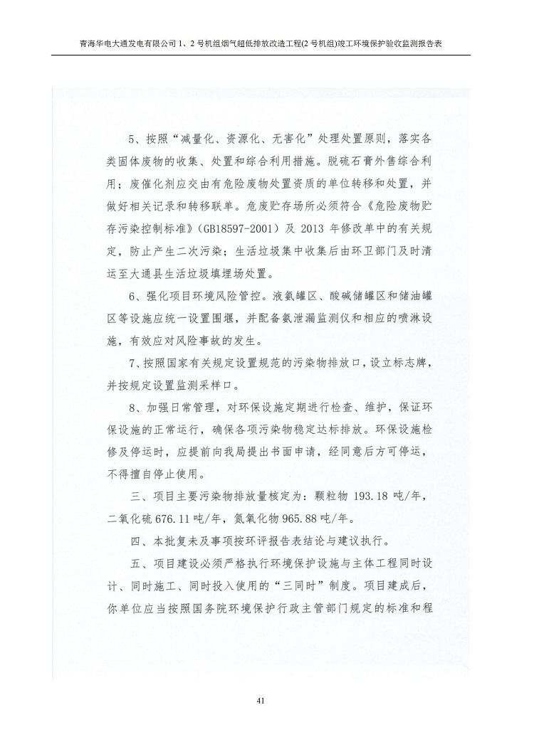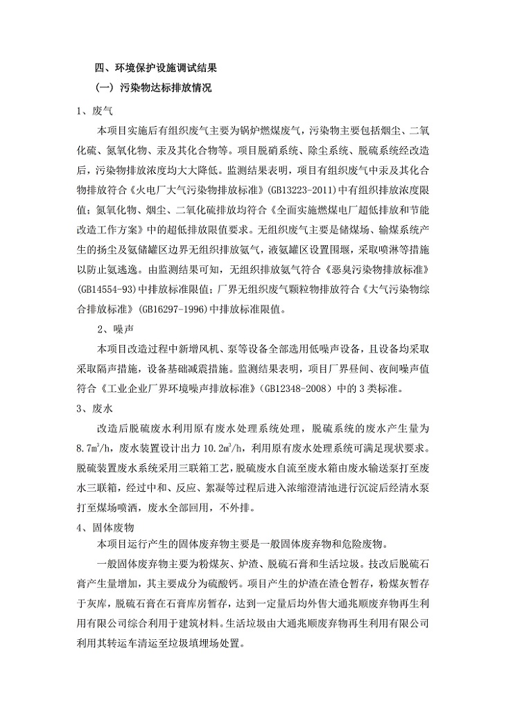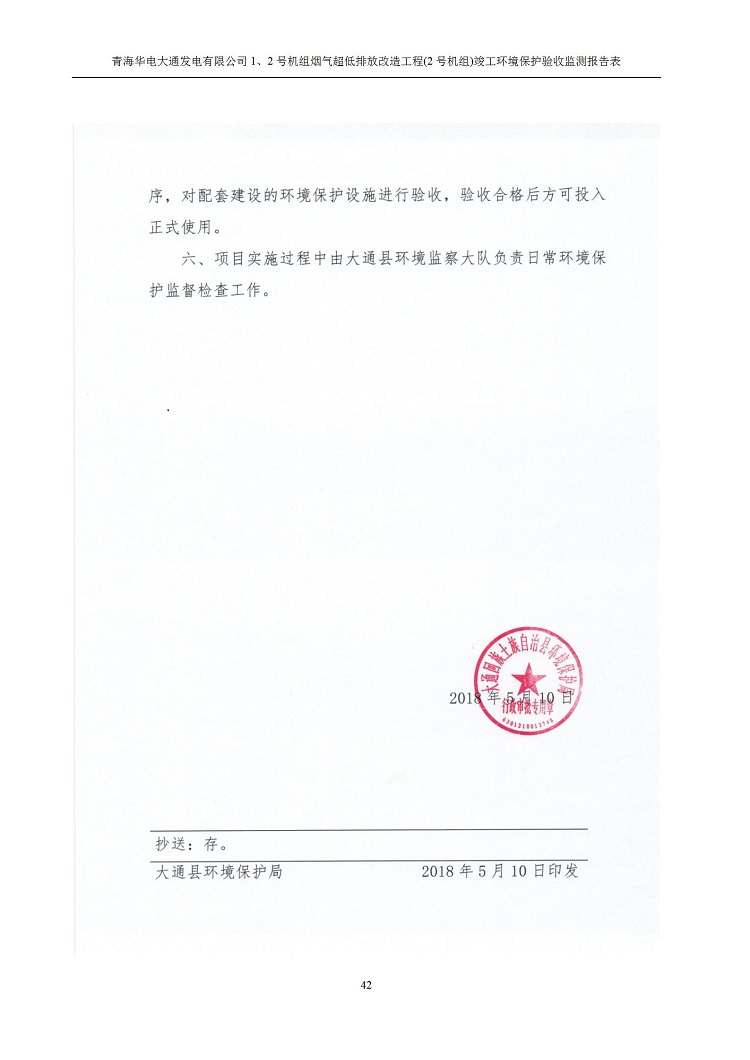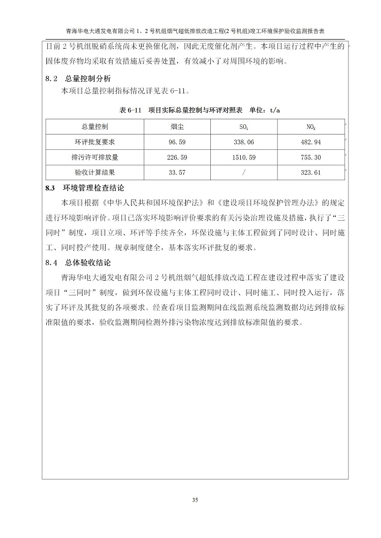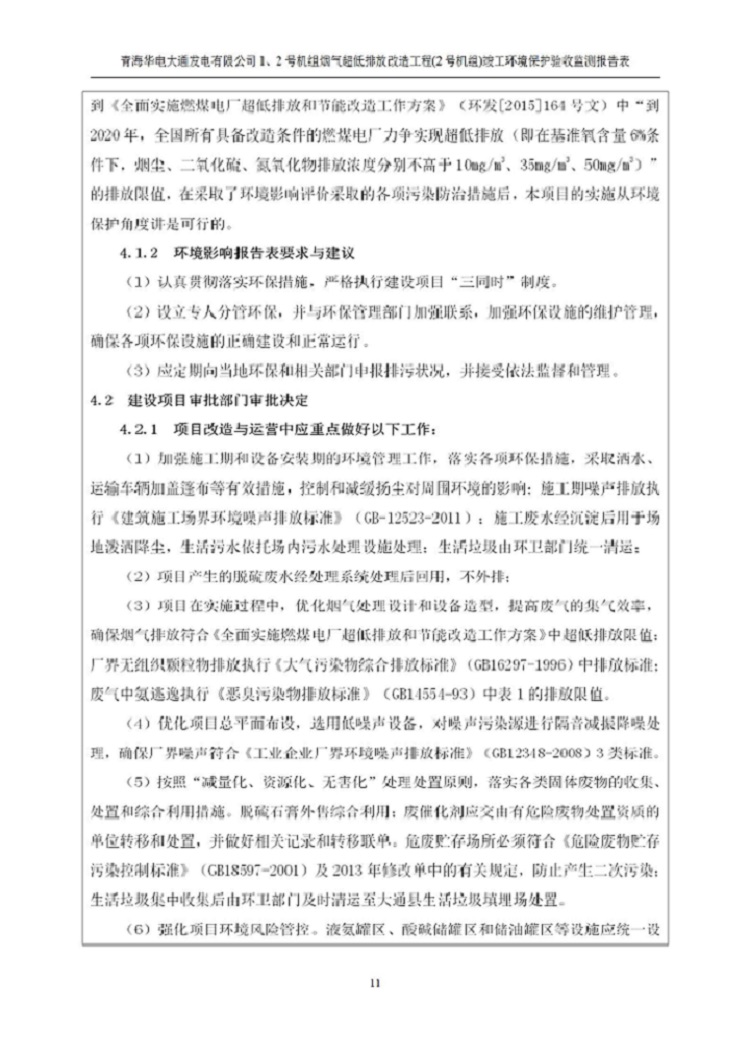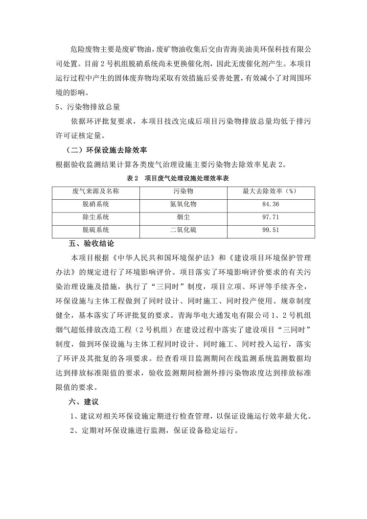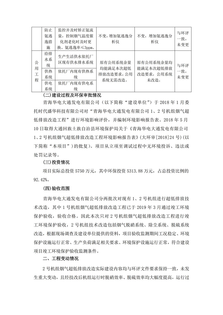 根據(jù)中華人民共和國國務(wù)院令第682號《國務(wù)院關(guān)于修改〈建設(shè)項(xiàng)目環(huán)境保護(hù)管理?xiàng)l例〉的決定》和《建設(shè)項(xiàng)目竣工環(huán)境保護(hù)驗(yàn)收暫行辦法》(國務(wù)院令682號),青海華電大通發(fā)電有限公司1、2號機(jī)組煙氣超低排放改造工程(2號機(jī)組) (包括竣工環(huán)境保護(hù)驗(yàn)收監(jiān)測報(bào)告表和驗(yàn)收意見)公示如下。 一、項(xiàng)目名稱:青海華電大通發(fā)電有限公司1、2號機(jī)組煙氣超低排放改造工程(2號機(jī)組) 竣工環(huán)境保護(hù)驗(yàn)收監(jiān)測報(bào)告表 二、地點(diǎn):青海省西寧市大通縣寧張公路31公里處 三、建設(shè)單位:青海華電大通發(fā)電有限公司 四、建設(shè)內(nèi)容:2號機(jī)組煙氣超低排放改造,2號機(jī)組改造內(nèi)容為脫硫系統(tǒng)保留原脫硫裝置作為一級塔,新建二級合金托盤塔串聯(lián)吸收塔;對原“1+2”電袋復(fù)合除塵器的一電場電源進(jìn)行改造,對布袋除塵器濾袋進(jìn)行更換;對原脫硝系統(tǒng)選擇性催化還原法(SCR)脫硝工藝加裝備用催化劑,每層催化劑增加聲波吹灰器,優(yōu)化SCR反應(yīng)器入口導(dǎo)流板。 五、聯(lián)系人:馬世敏 六、聯(lián)系電 話:0971-6515411 七、公示時(shí)間:二〇二〇年四月二十九日至二〇二〇年五月二十八日 公示期間,對上述公示內(nèi)容如有異議,請以書面形式反饋,個(gè)人須署真實(shí)姓名,單位須加蓋公章。