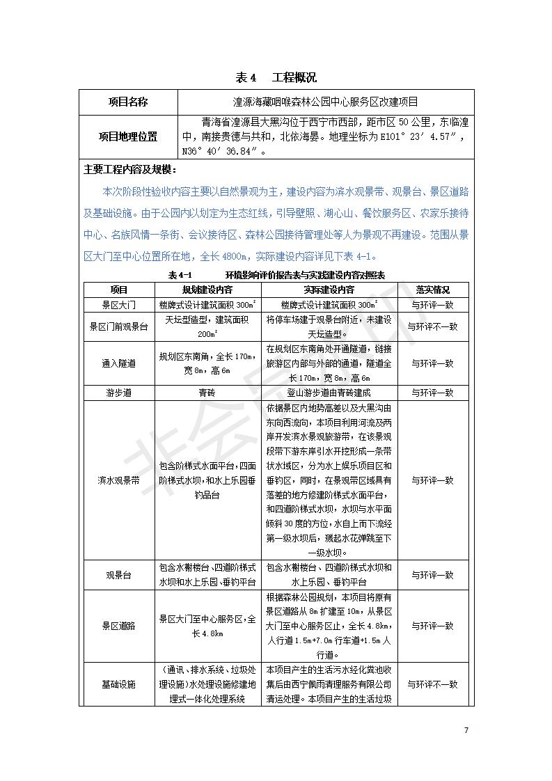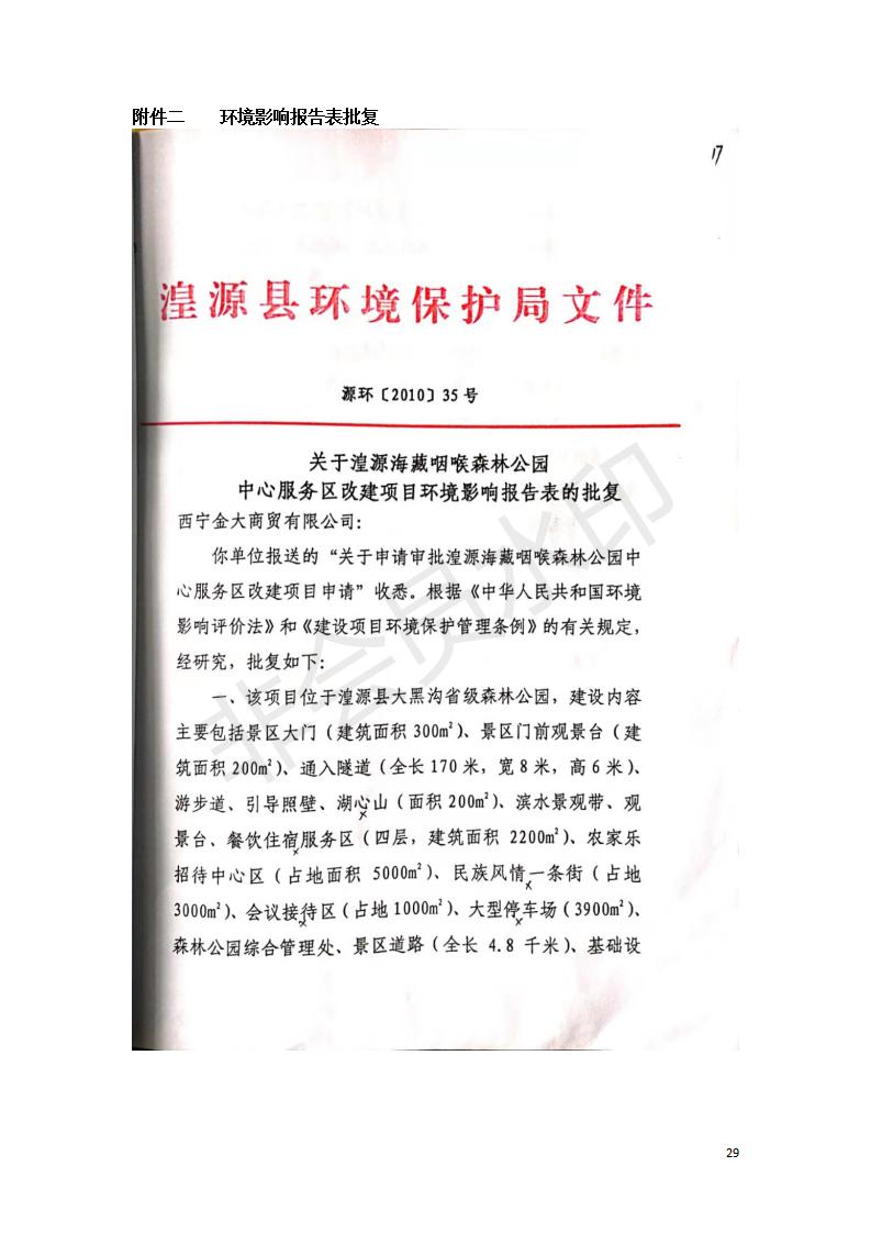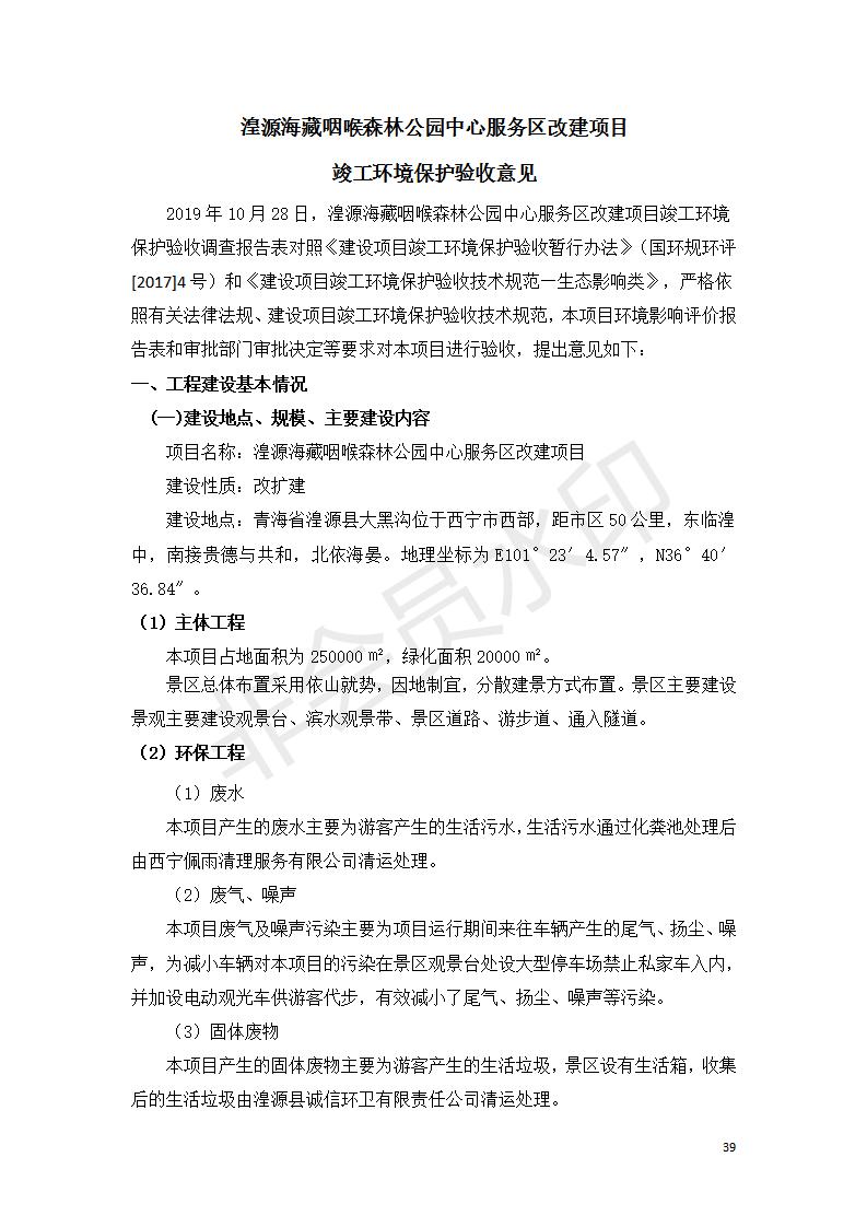 根據(jù)中華人民共和國(guó)國(guó)務(wù)院令第682號(hào)《國(guó)務(wù)院關(guān)于修改〈建設(shè)項(xiàng)目環(huán)境保護(hù)管理?xiàng)l例〉的決定》和《建設(shè)項(xiàng)目竣工環(huán)境保護(hù)驗(yàn)收暫行辦法》(國(guó)務(wù)院令682號(hào)),湟源海藏咽喉森林公園中心服務(wù)區(qū)改建項(xiàng)目(階段性),(包括竣工環(huán)境保護(hù)驗(yàn)收調(diào)查表和驗(yàn)收意見)公示如下。 一、項(xiàng)目名稱:湟源海藏咽喉森林公園中心服務(wù)區(qū)改建項(xiàng)目(階段性) 竣工環(huán)境保護(hù)驗(yàn)收調(diào)查表 二、地點(diǎn):青海省湟源縣東峽鄉(xiāng)大黑溝 三、建設(shè)單位:西寧金大旅游開發(fā)有限公司 四、建設(shè)內(nèi)容:本次階段性驗(yàn)收以自然景觀為主,建設(shè)內(nèi)容為濱水景觀帶、觀景臺(tái)、景區(qū)道路及基礎(chǔ)設(shè)施。項(xiàng)目范圍從景區(qū)大門至中心位置,全長(zhǎng)4800m。 五、聯(lián)系人:張工 六、聯(lián)系電 話:0971-6515411 七、公示時(shí)間:二〇二〇年四月二十九日至二〇二〇年五月二十八日 公示期間,對(duì)上述公示內(nèi)容如有異議,請(qǐng)以書面形式反饋,個(gè)人須署真實(shí)姓名,單位須加蓋公章。